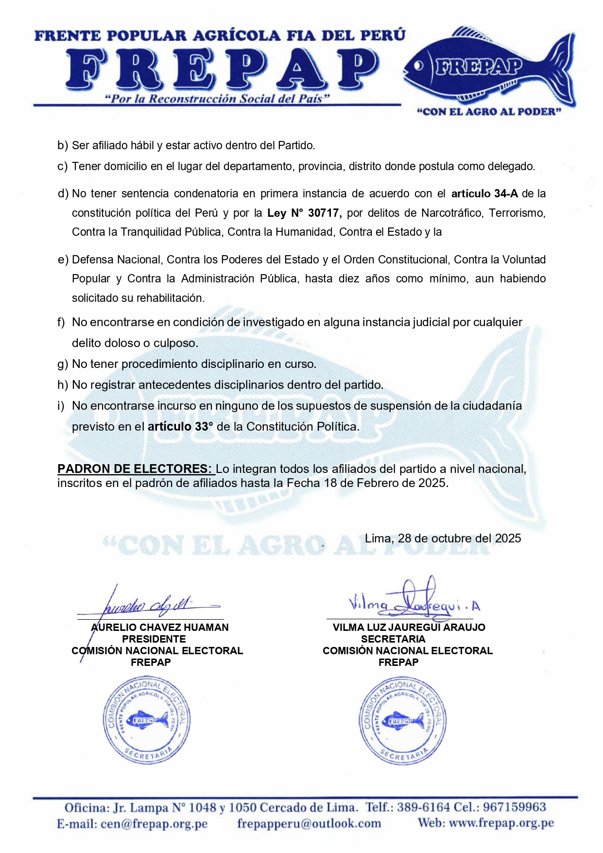 CANDIDATOS HÁBILES FREPAP ELECCIONES GENERALES 2026